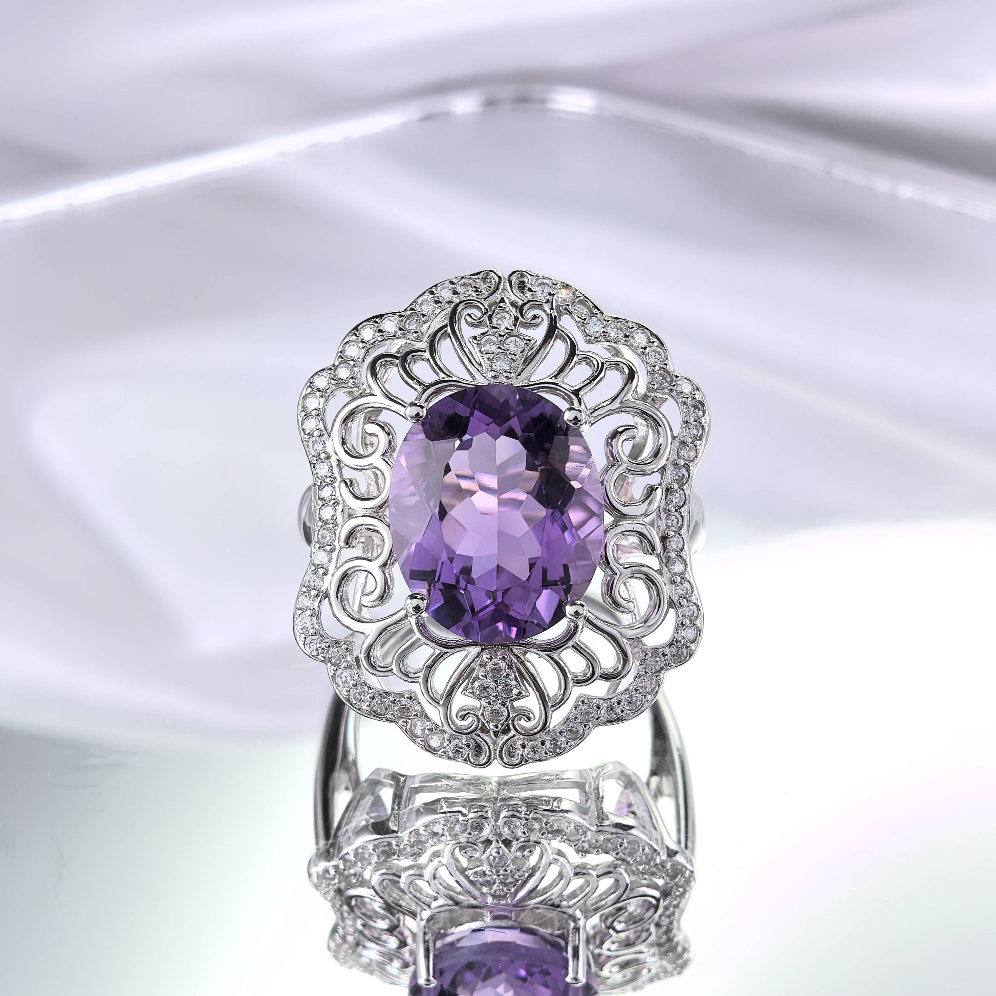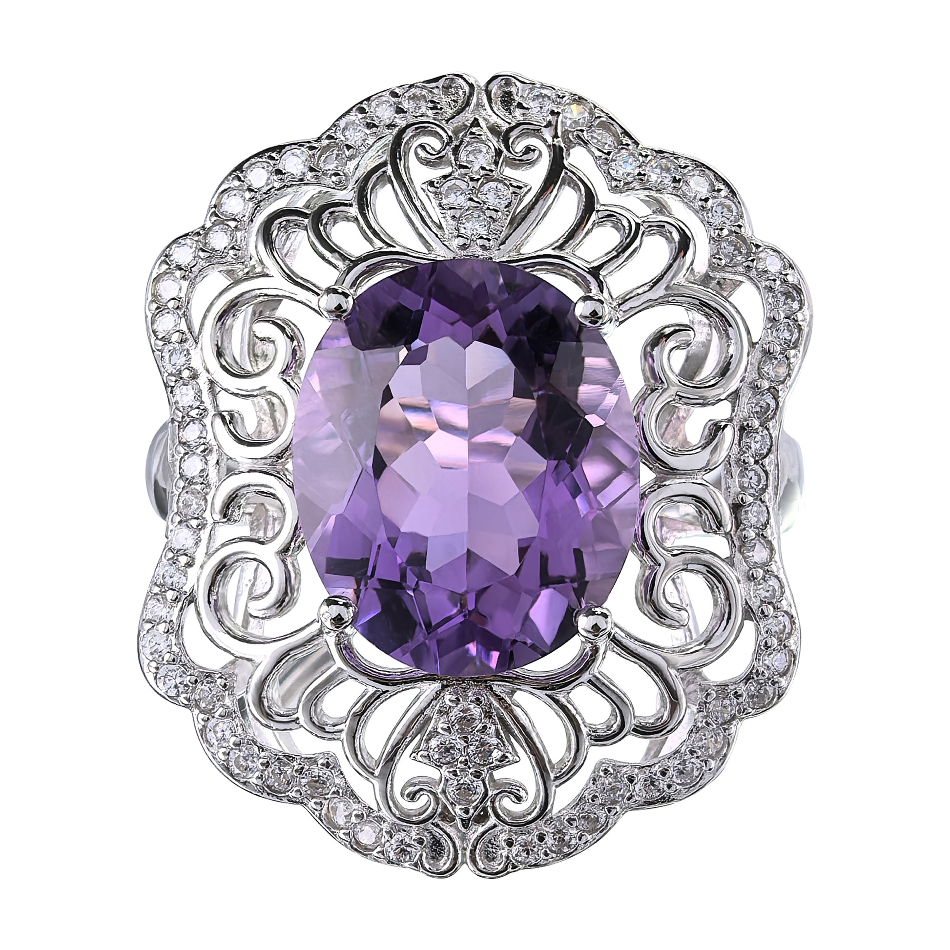 Artistic Rhodium Plated Sterling Silver 925 Natural Amethyst Ring