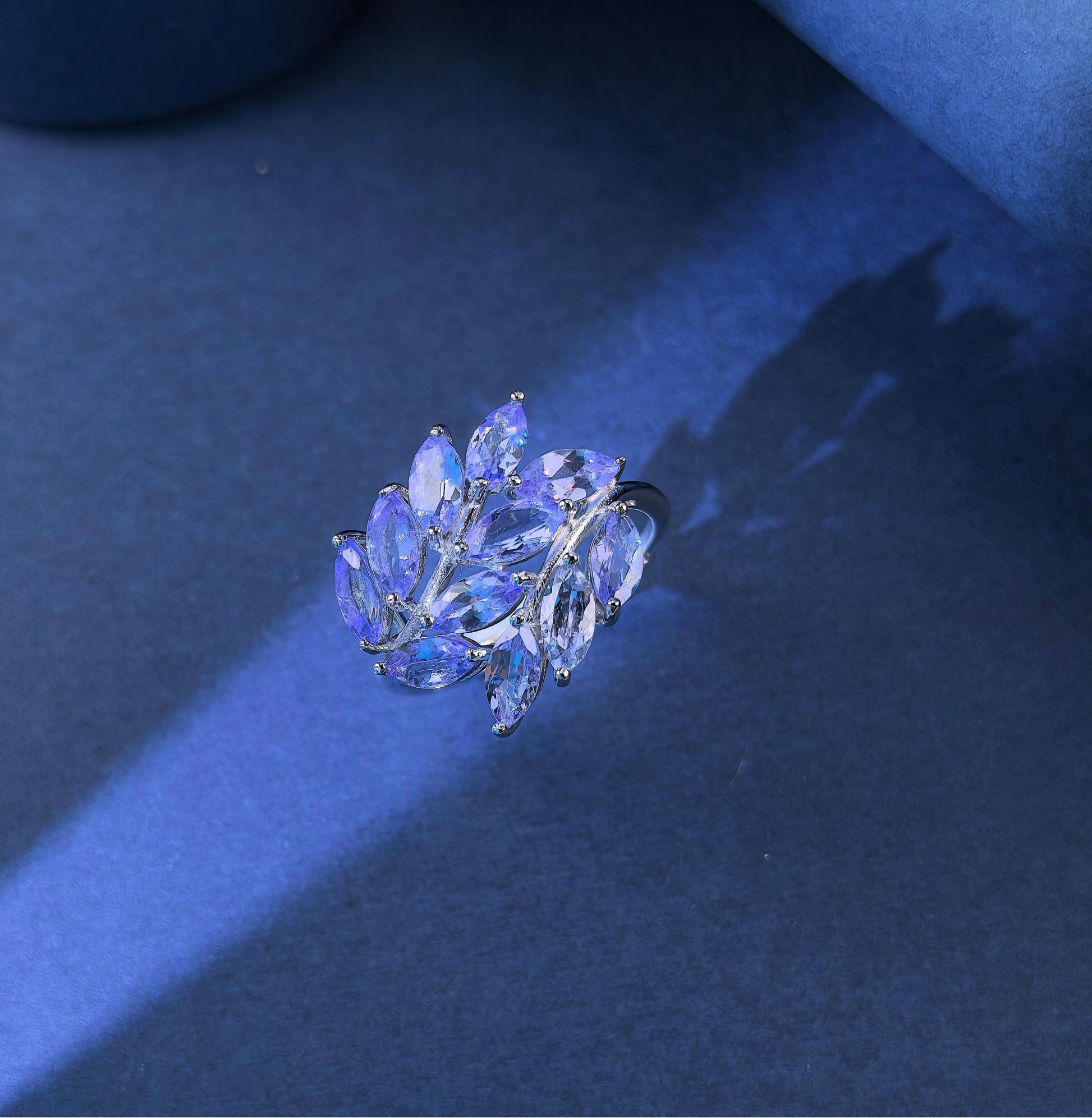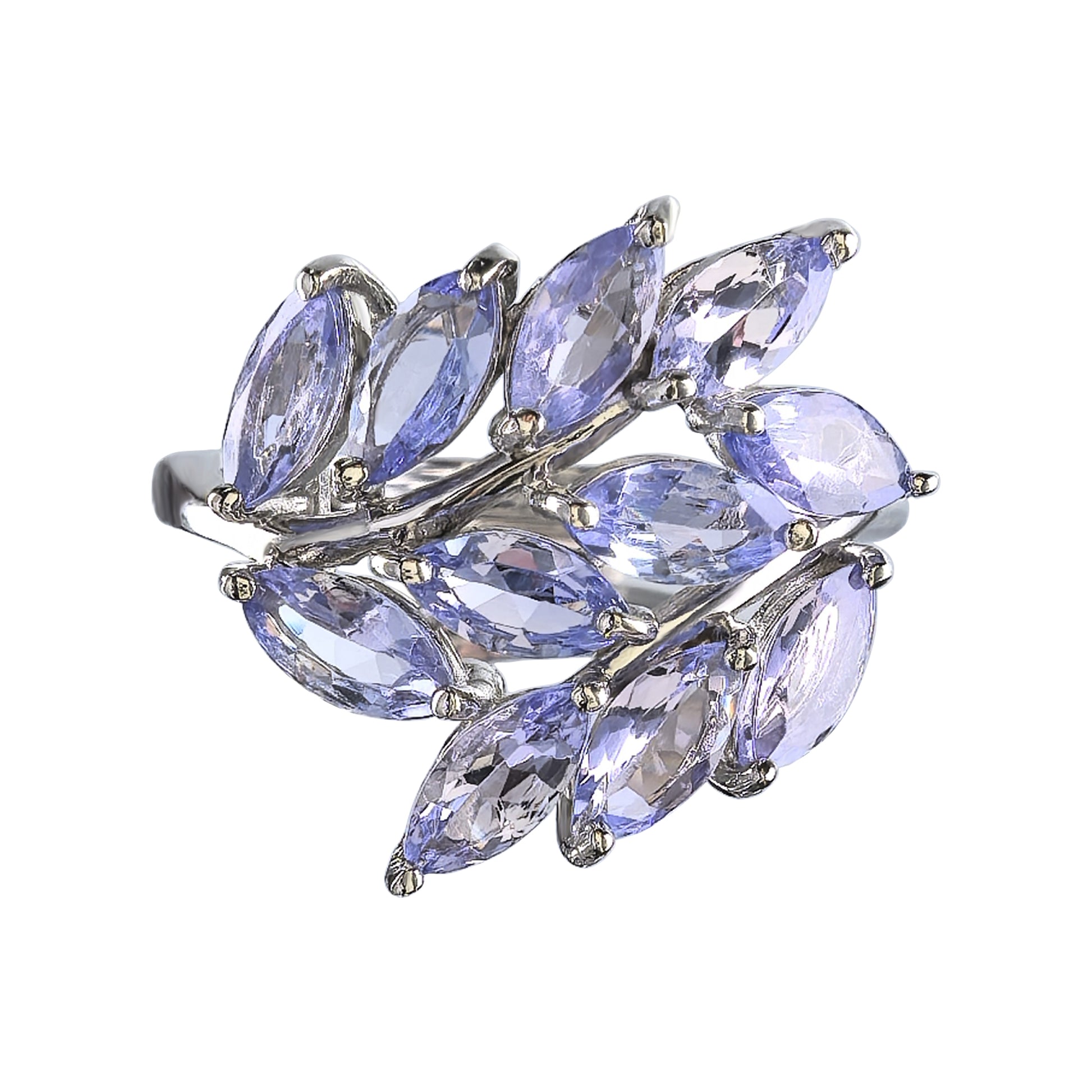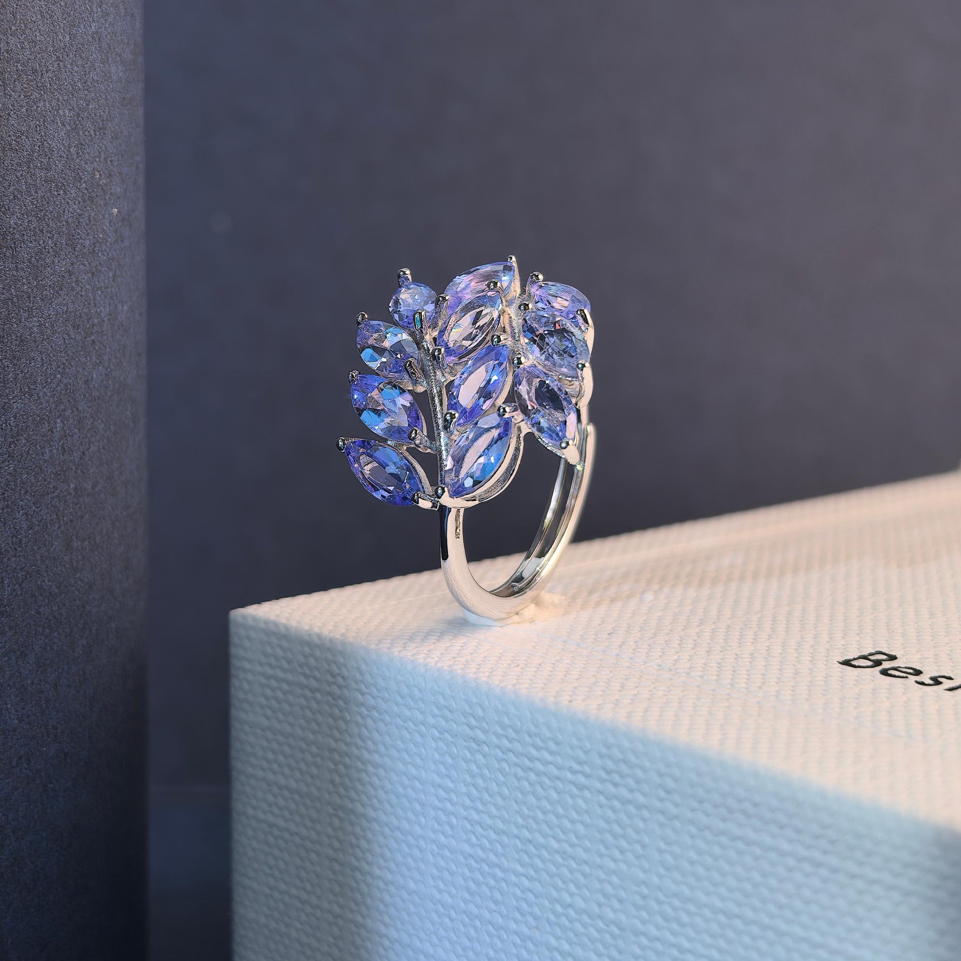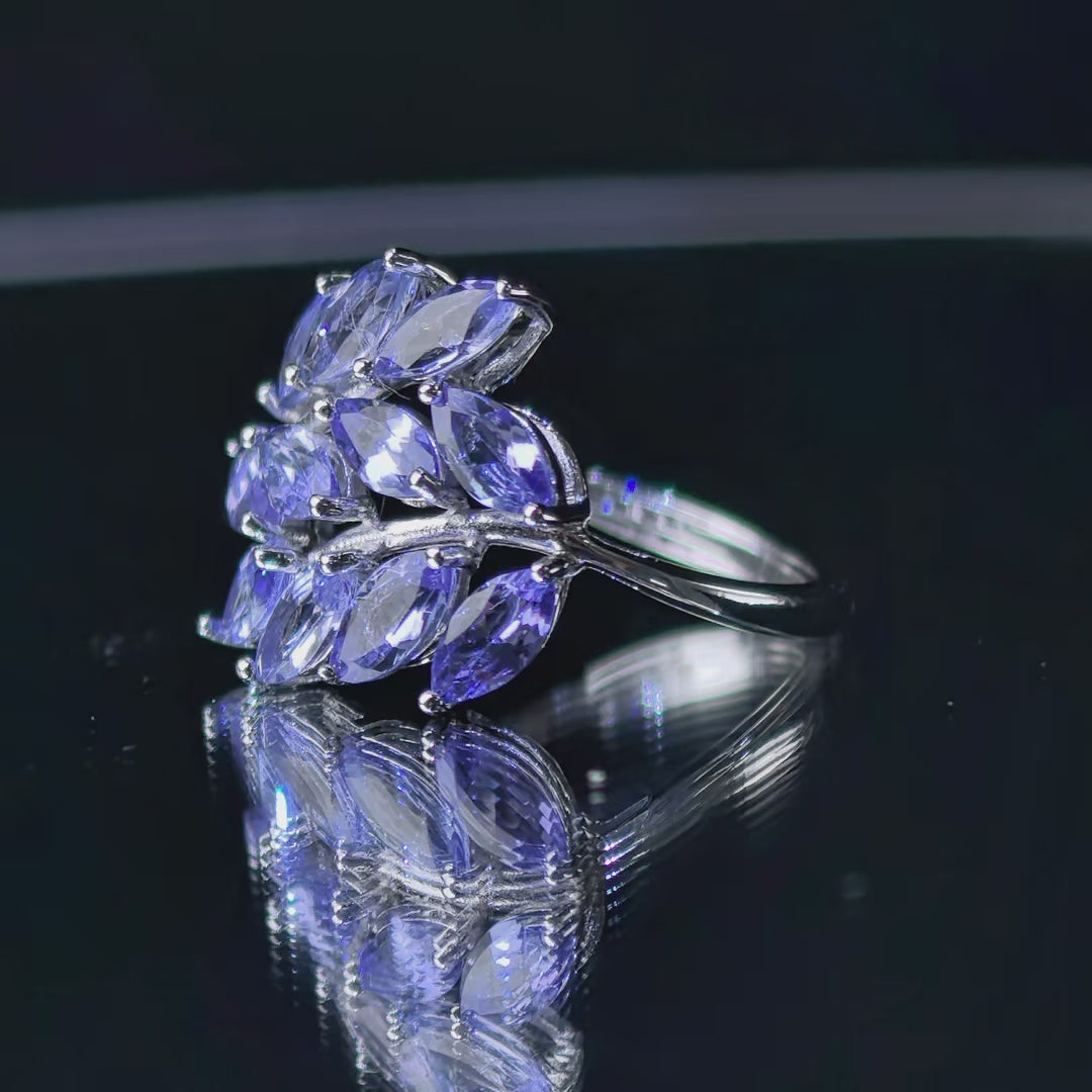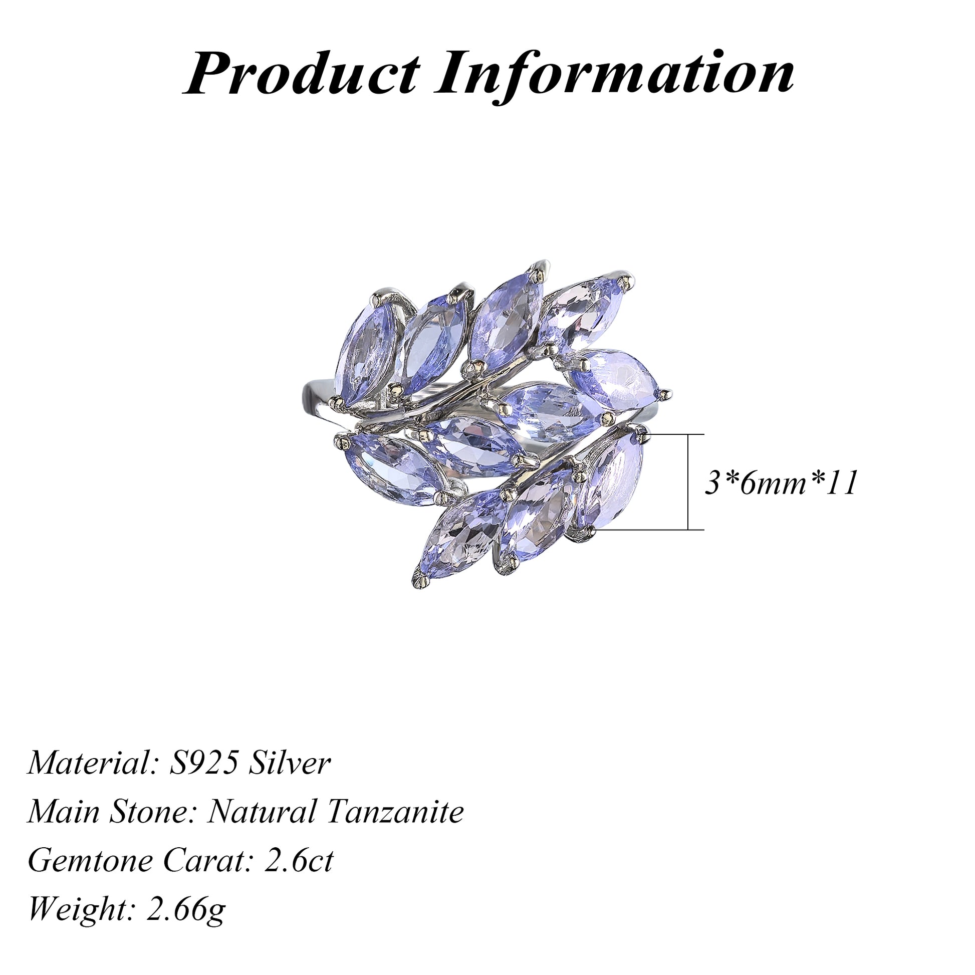 Charming Rhodium Plated Silver 925 Jewelry Natural Tanzanite Leaves Ring