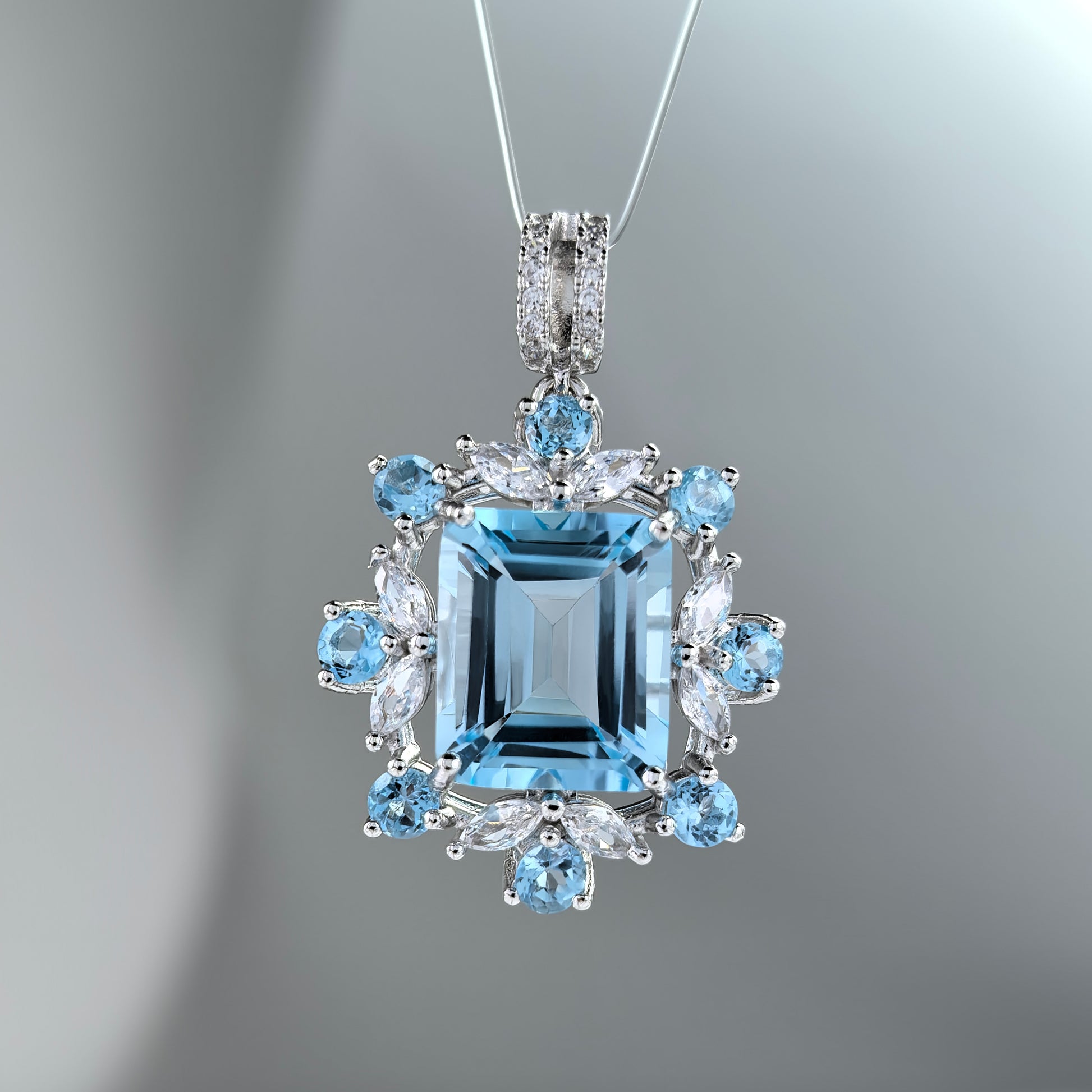 Delicate Rhodium Plated 925 Silver Emerald Cut Natural Sky Blue Topaz Pendant