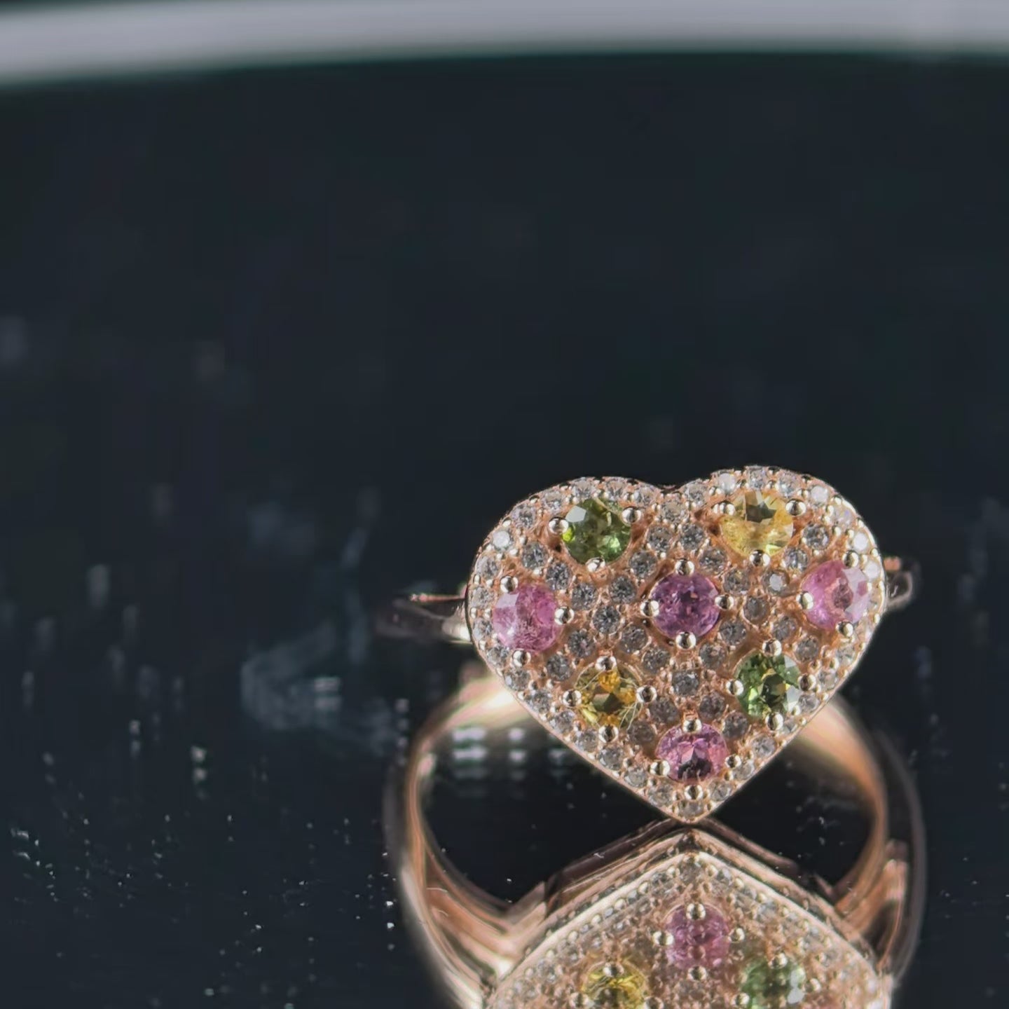 Delicate Rose Gold Plated 925 Silver Jewelry Natural Tourmaline Heart Ring