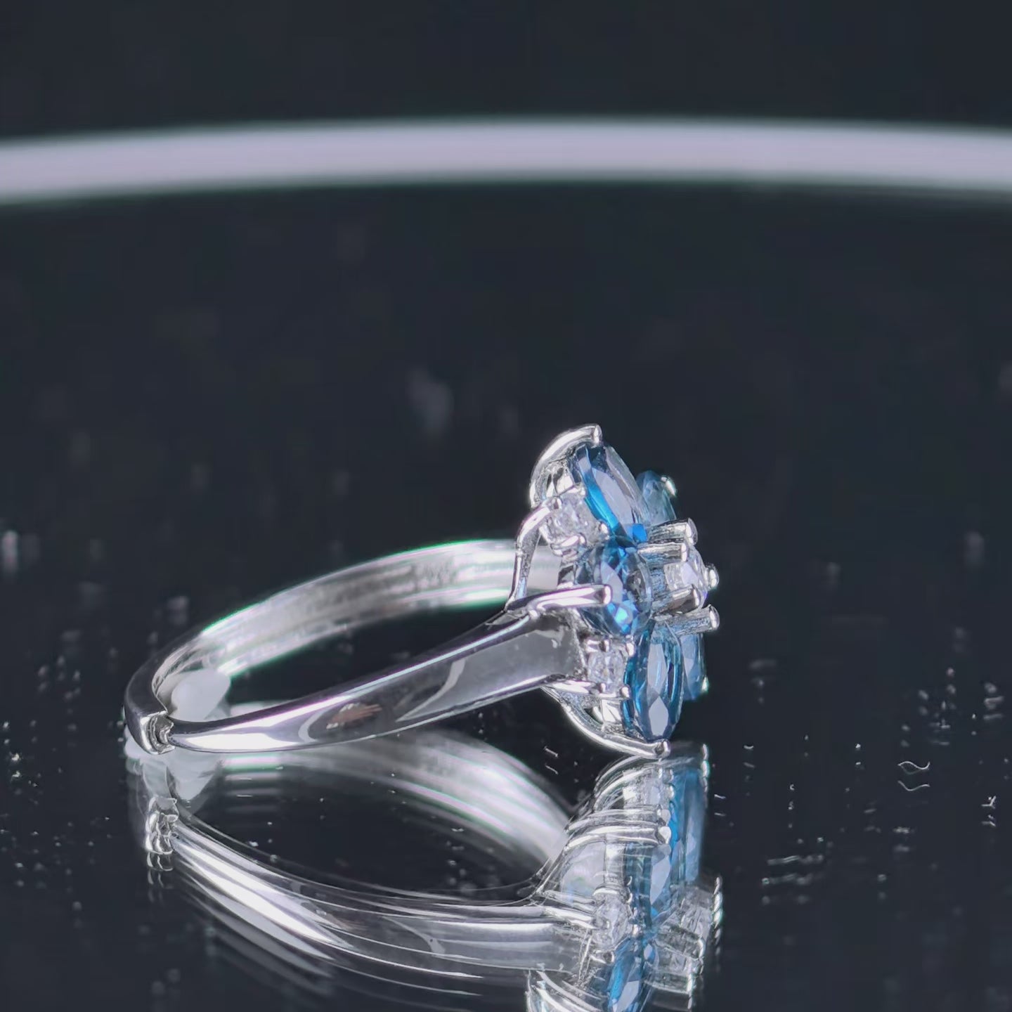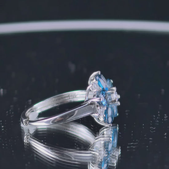 Elegant Rhodium Plated Silver 925 Jewelry Natural London Blue Topaz Flower Ring