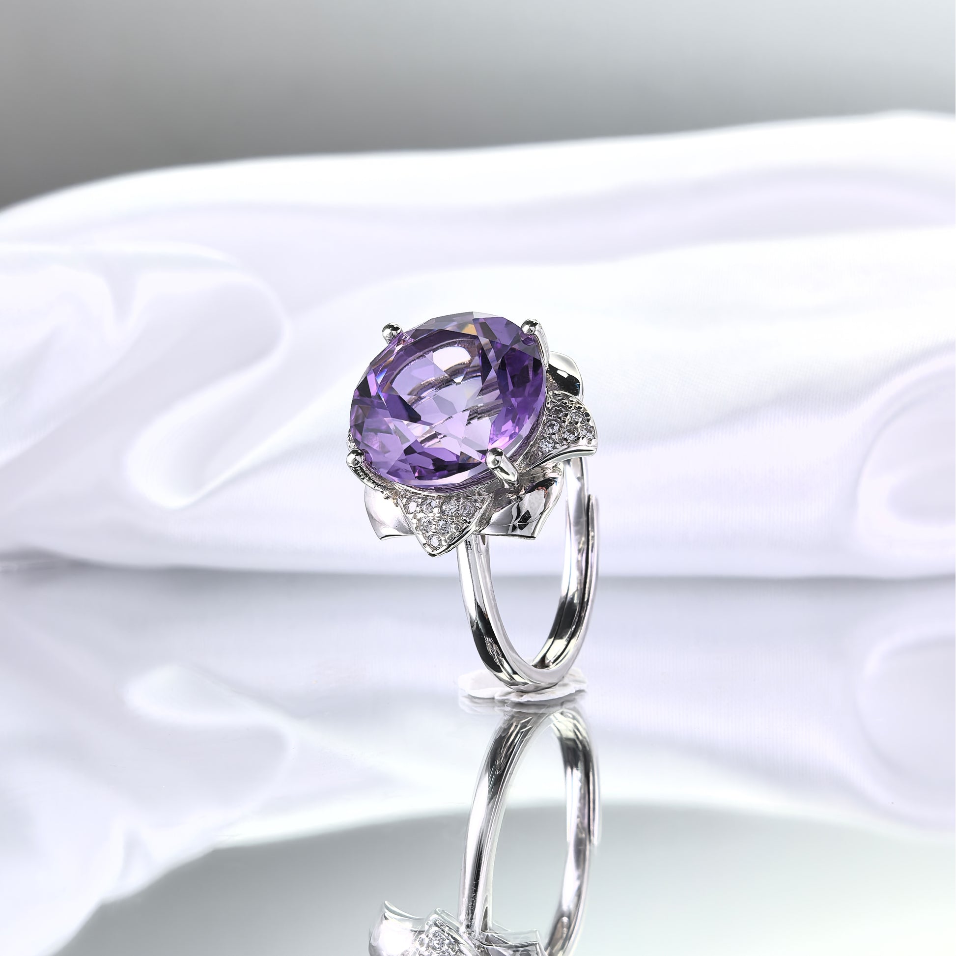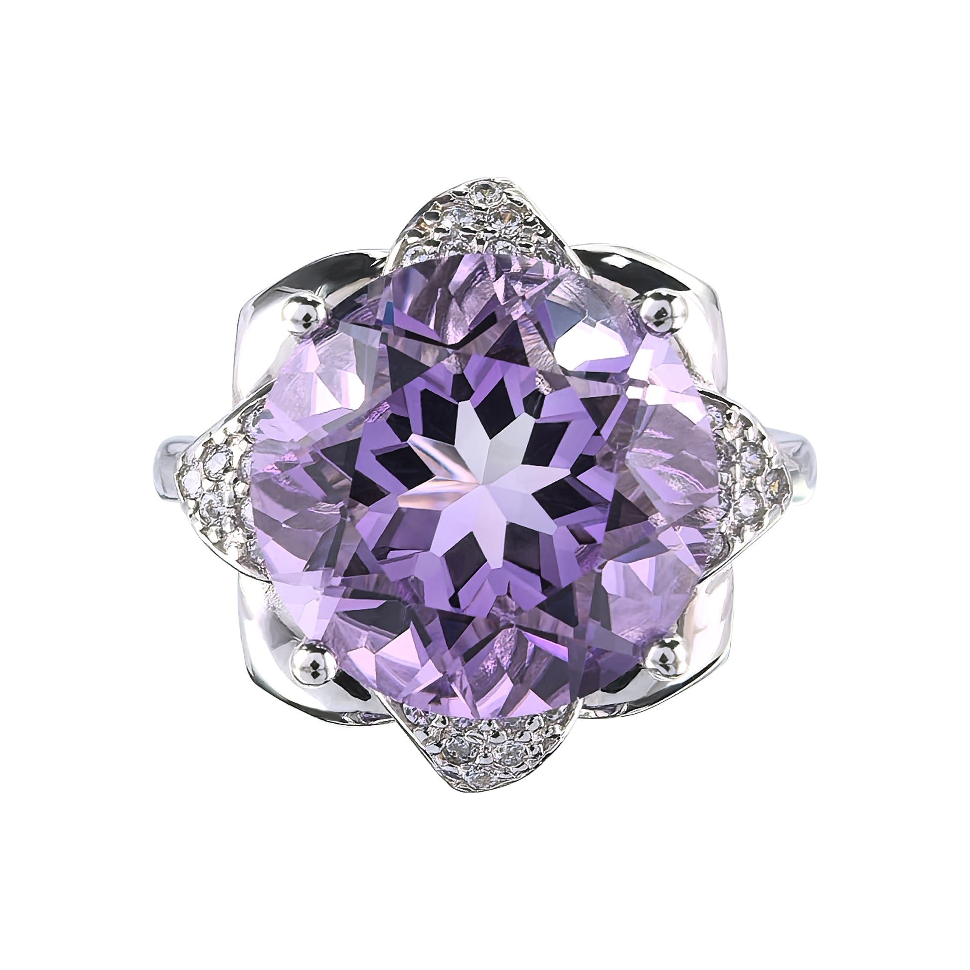 Gorgeous Rhodium Plated Silver 925 Natural Amethyst Flower Ring
