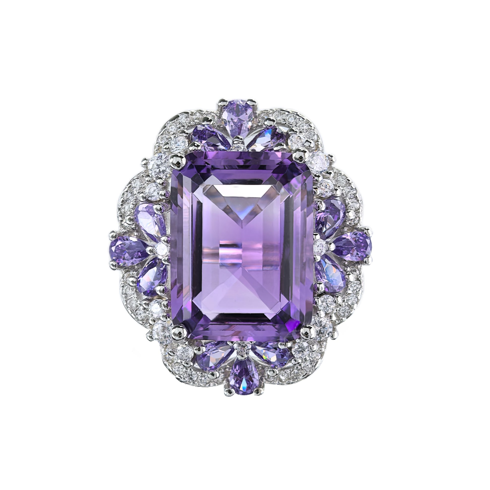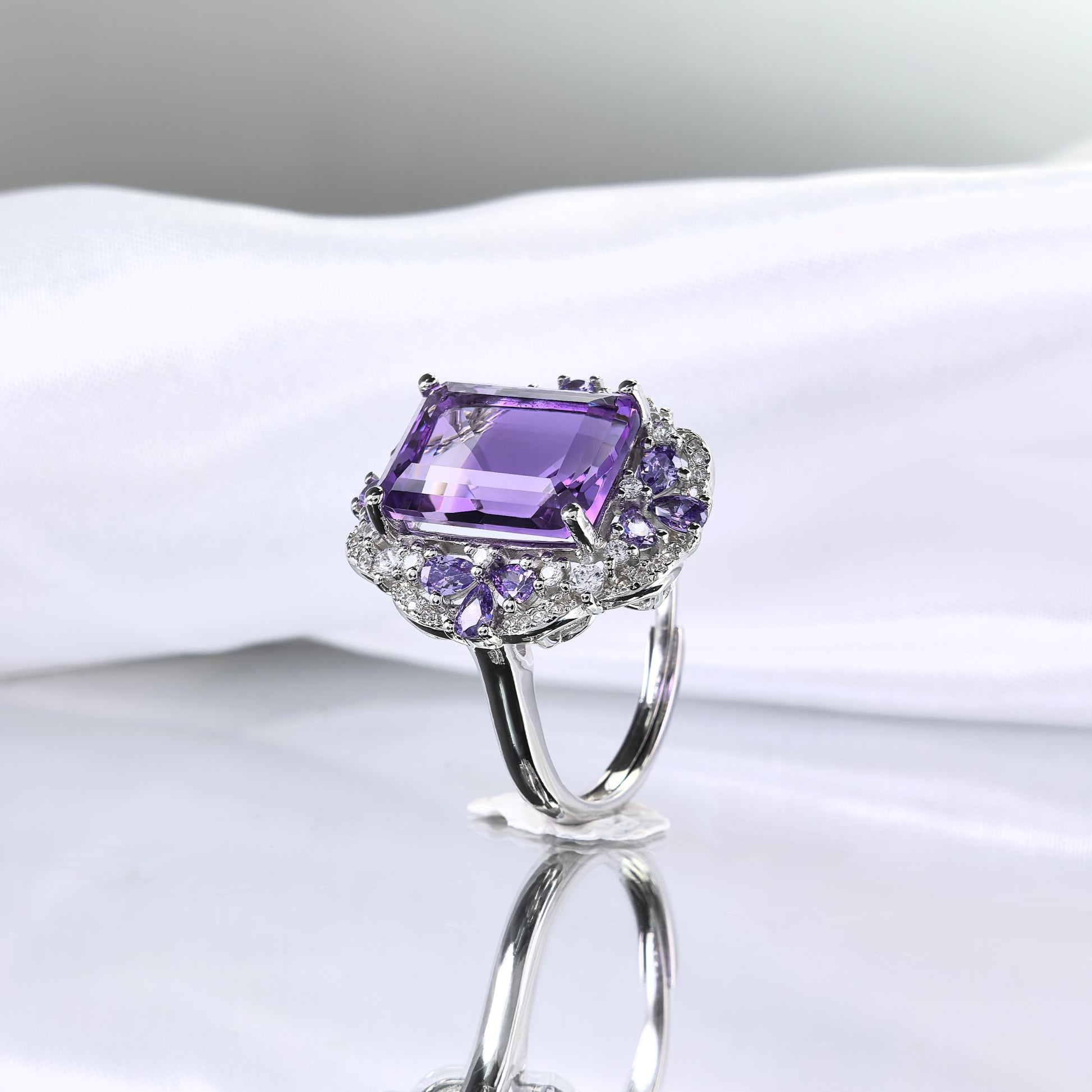 Graceful Rhodium Plated 925 Sterling Silver Natural Amethyst Flower Ring