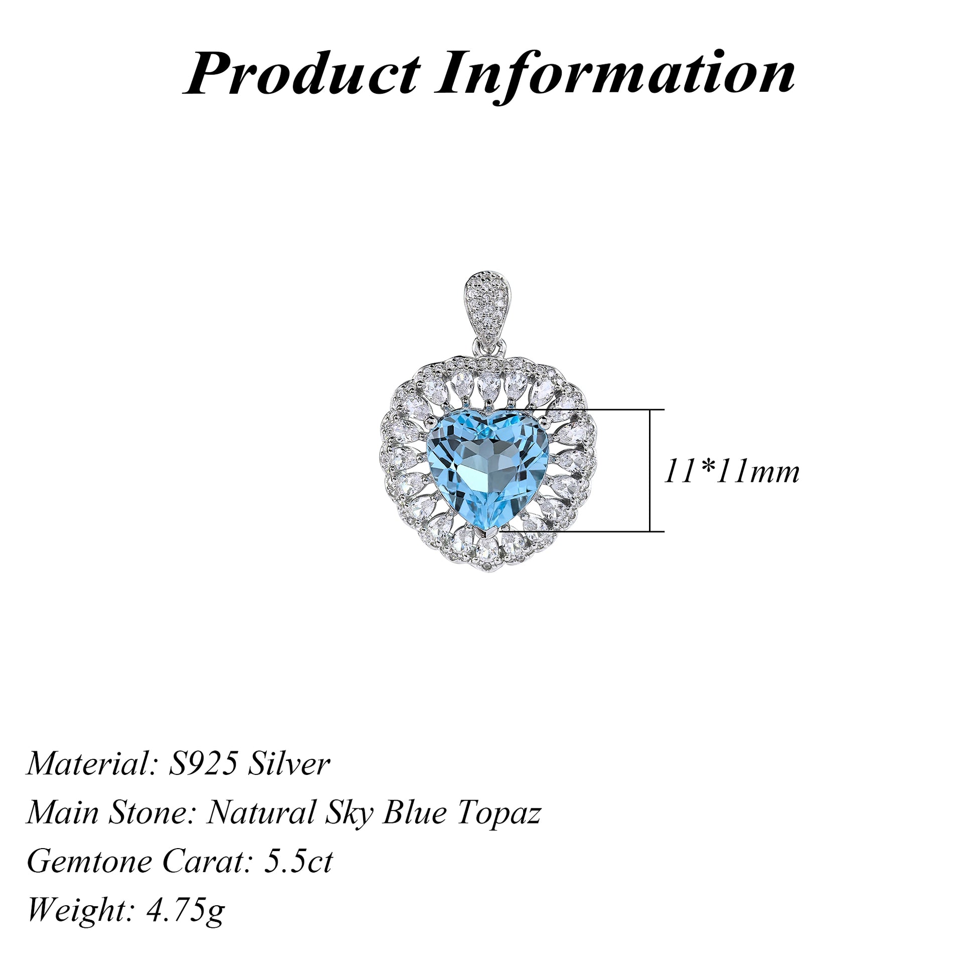 Romantic Rhodium-Plated 925 Sterling Silver Heart Pendant Natural Sky Blue Topaz